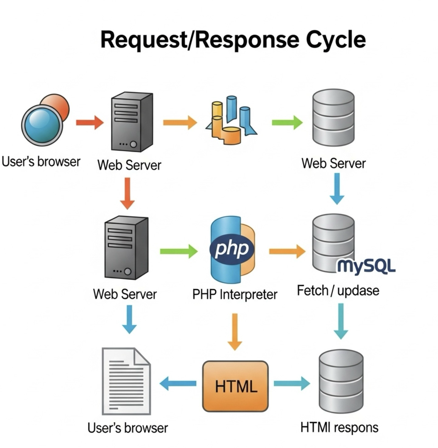 - 웹 서버 응답 (Response): PHP 인터프리터는 이렇게 만들어진 HTML 코드를 다시 웹 서버에 전달하고, 웹 서버는 이 HTML 코드를 사용자 웹 브라우저로 보냅니다.