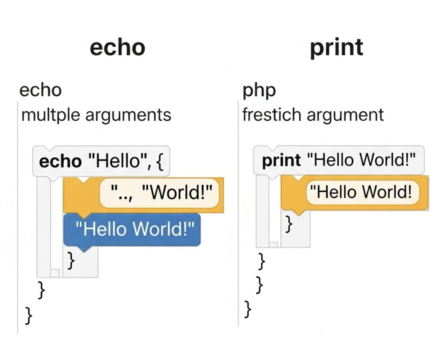 두 구문 모두 결과는 동일하게 "안녕하세요 PHP!" 또는 "안녕하세요, PHP!"가 출력됩니다. 하지만 echo는 여러 개의 인자를 쉼표(,)로 구분하여 출력할 수 있다는 점에서 print와 차이가 있습니다. print는 하나의 인자만 출력할 수 있습니다.