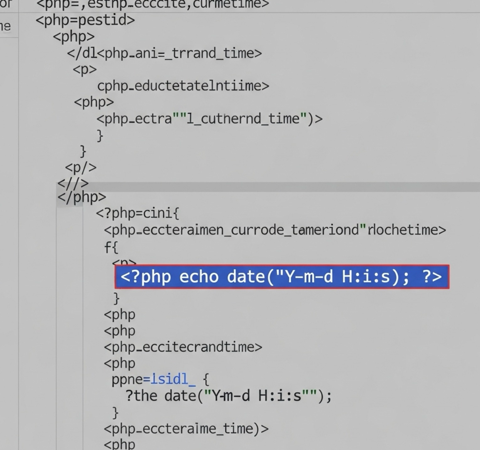 위 예시에서 <p> 태그 내부에 <?php echo date("Y-m-d H:i:s"); ?>라는 PHP 코드가 삽입되어 있습니다. date("Y-m-d H:i:s") 함수는 현재 날짜와 시간을 지정된 형식으로 반환하는 PHP 내장 함수입니다. 웹 서버가 이 파일을 처리하면 PHP 코드가 실행되어 현재 날짜와 시간 문자열로 바뀌고, 최종적으로 웹 브라우저에는 동적인 현재 시간이 표시됩니다.