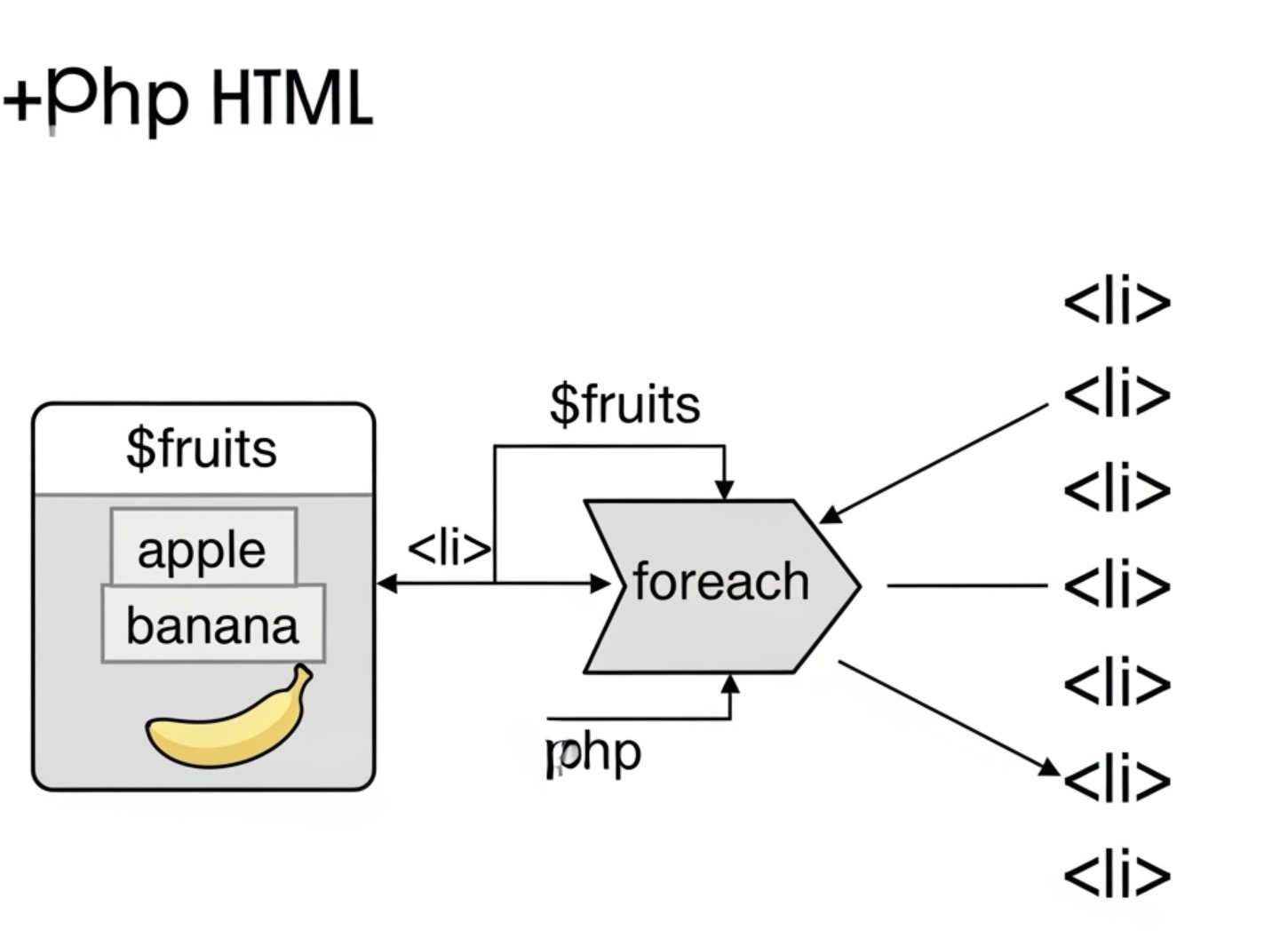 위 코드에서 $fruits라는 배열에 과일 이름들이 저장되어 있습니다. foreach 반복문을 사용하여 배열의 각 요소를 순회하면서 <li> 태그와 함께 과일 이름을 출력합니다. PHP 코드가 실행되면 각 과일 이름에 대한 <li> 태그가 생성되어 HTML 목록 형태로 웹 페이지에 표시됩니다.