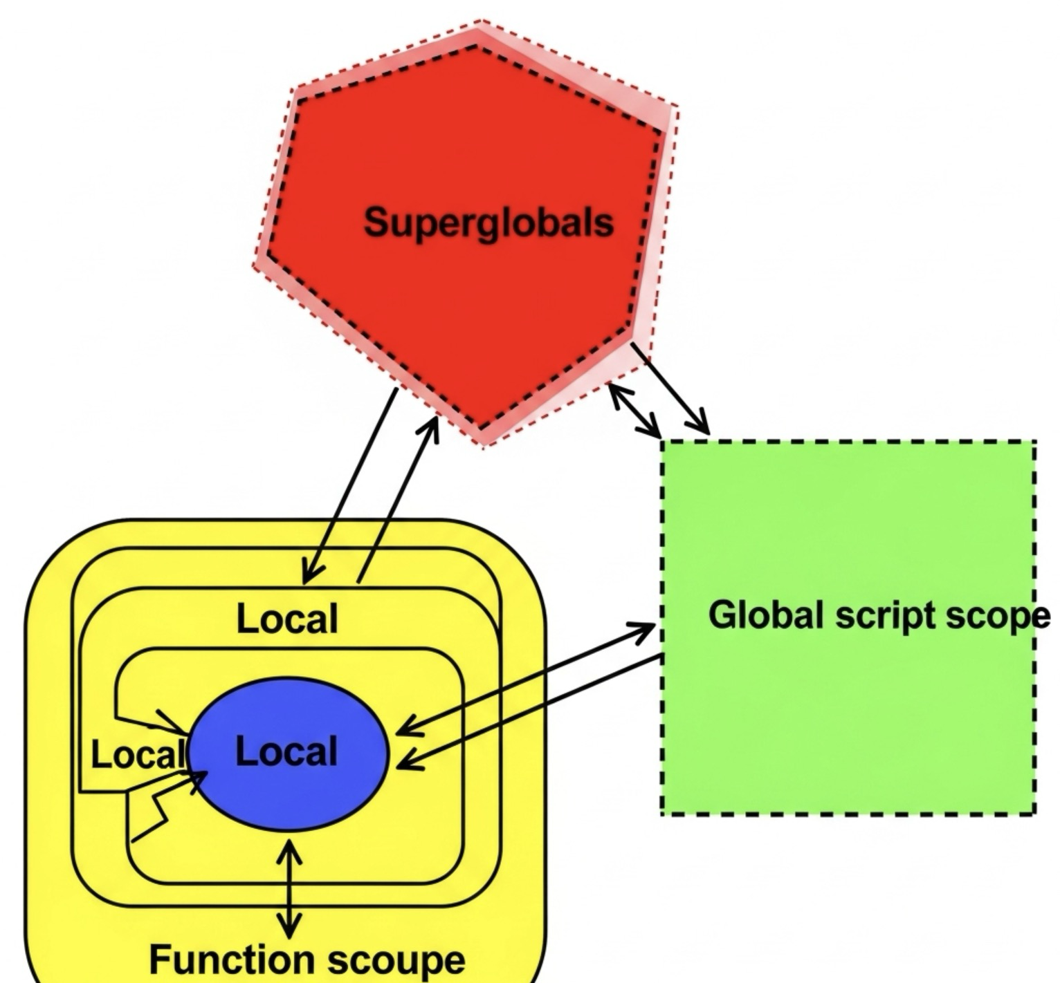 #변수 의 #스코프 는 해당 #변수 가 접근 가능한 코드 영역을 의미합니다. PHP에서는 주로 다음과 같은 #변수 #스코프 를 가집니다.