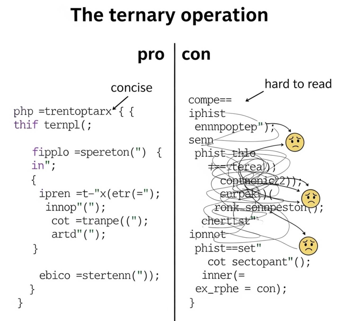 - #가독성_저하 (복잡한 조건): 조건이 복잡해지거나 중첩될 경우, #삼항_연산자 를 과도하게 사용하면 코드의 가독성이 오히려 떨어질 수 있습니다.