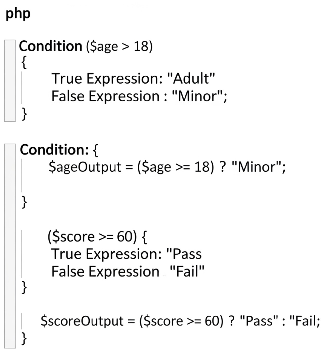 - #표현식_내에서_사용_가능: #삼항_연산자 는 값을 반환하므로, 다른 #표현식 내에서 직접 사용할 수 있습니다.echo "결과: " . (($score >= 60) ? "Pass" : "Fail");