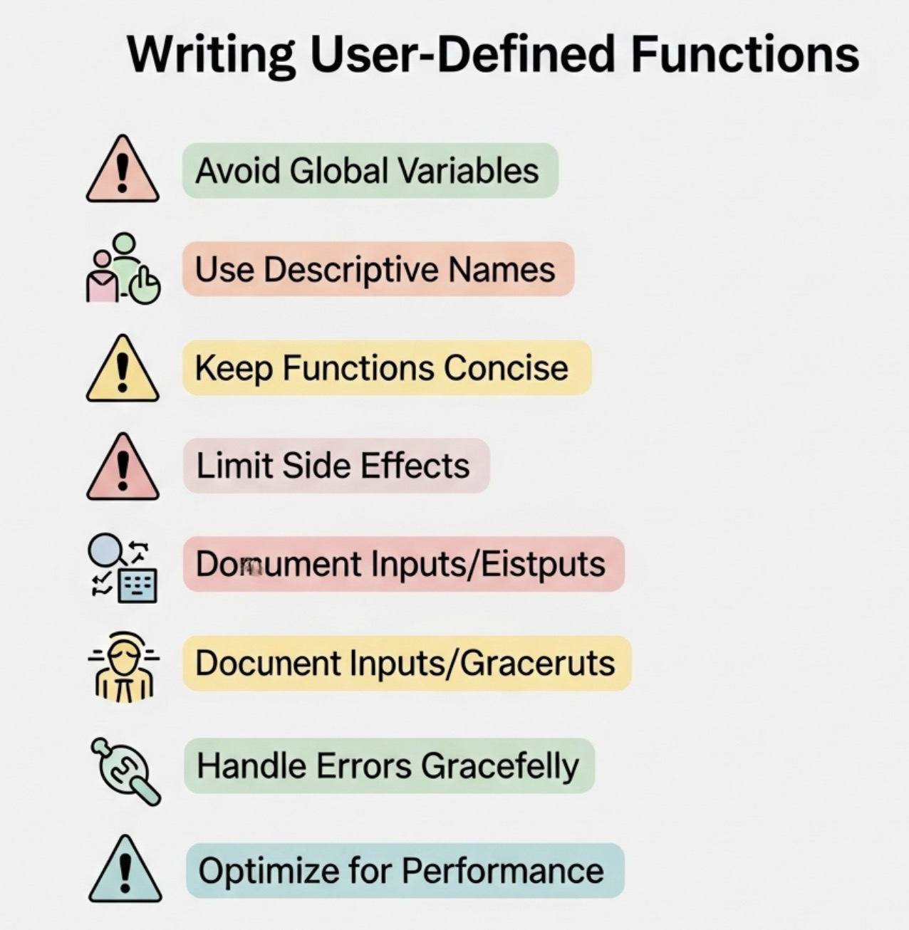 - 적절한 매개변수 설계: 함수가 필요로 하는 입력 값을 명확히 정의하고, 매개변수의 개수를 적절하게 유지하는 것이 좋습니다.