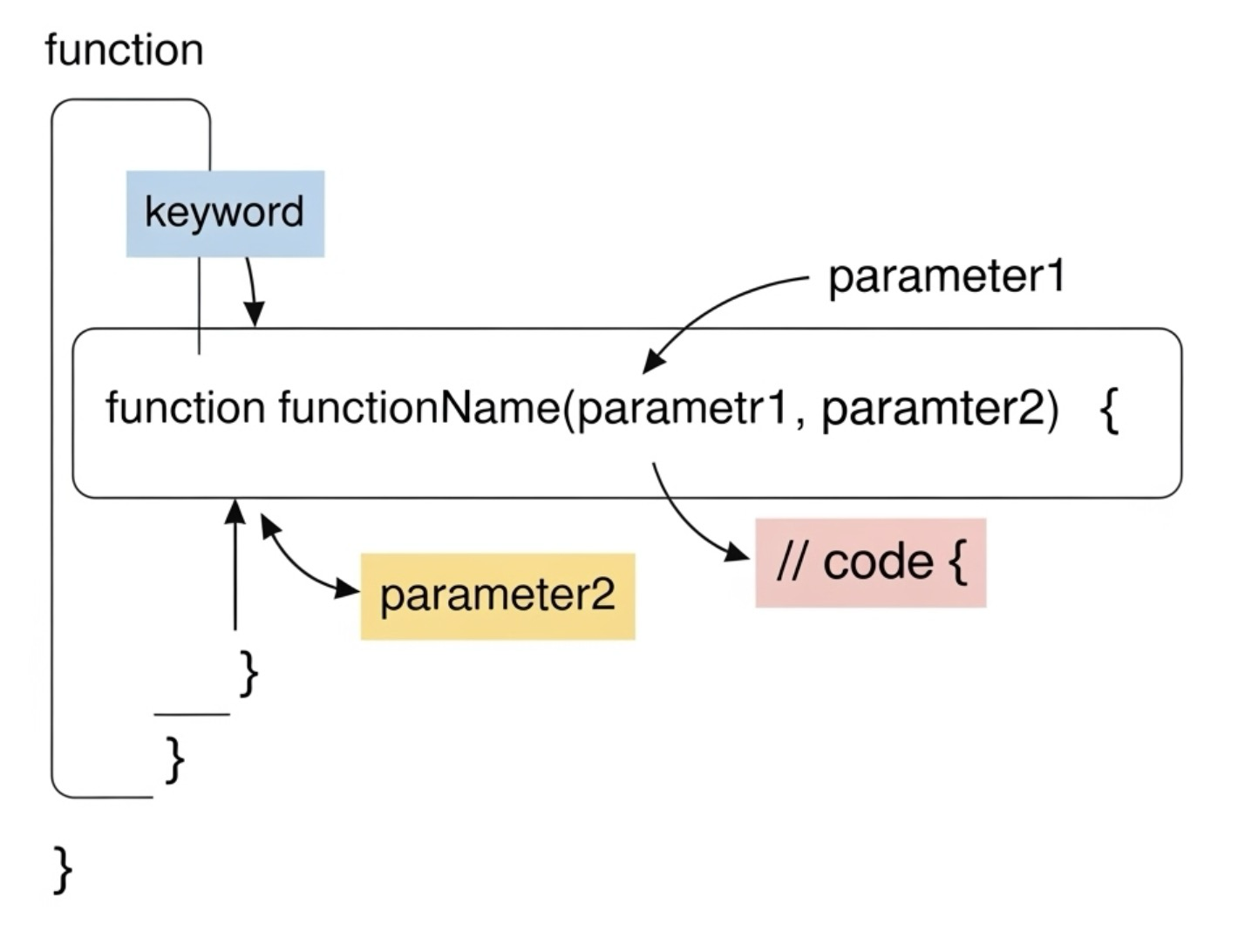 function 함수이름(매개변수1, 매개변수2, ...) {