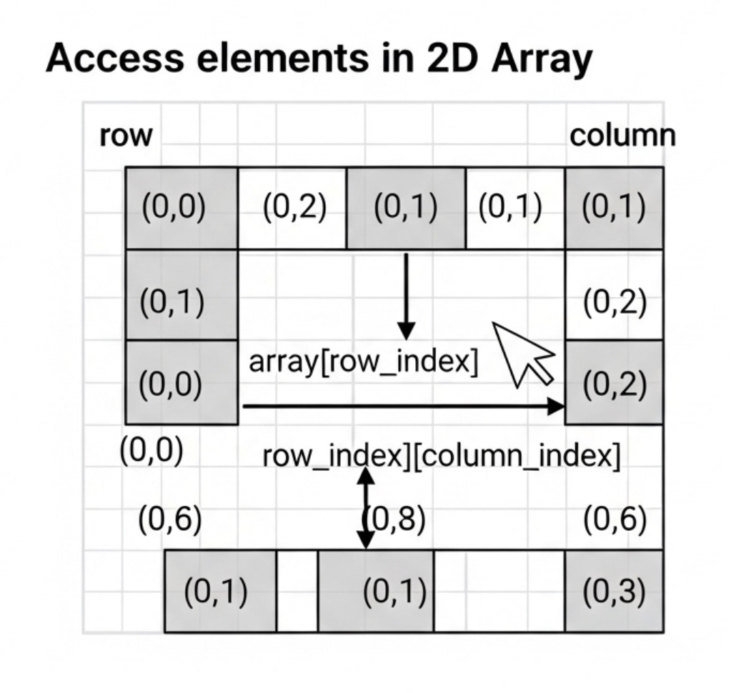 2차원 배열은 기본적으로 바깥쪽 배열의 인덱스와 안쪽 배열의 인덱스/키를 조합하여 데이터에 접근합니다.