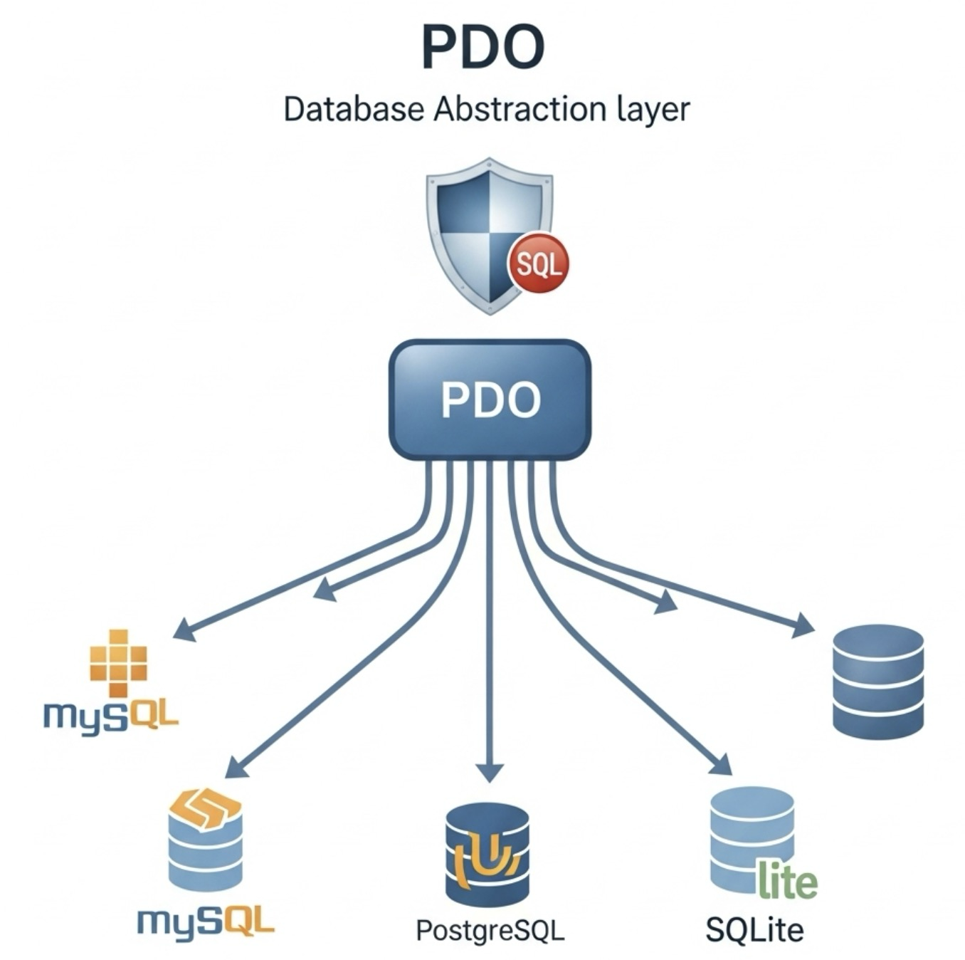 PDO는 이러한 문제를 해결하기 위해 등장했습니다. PDO는 #데이터베이스 #추상화 #계층(Database Abstraction Layer)을 제공하여, 사용하는 데이터베이스의 종류(MySQL, PostgreSQL, SQLite 등)에 관계없이 동일한 인터페이스로 데이터베이스 작업을 수행할 수 있게 해줍니다. 이는 데이터베이스를 변경할 필요가 생길 때 코드 수정을 최소화할 수 있다는 강력한 장점이 있습니다.