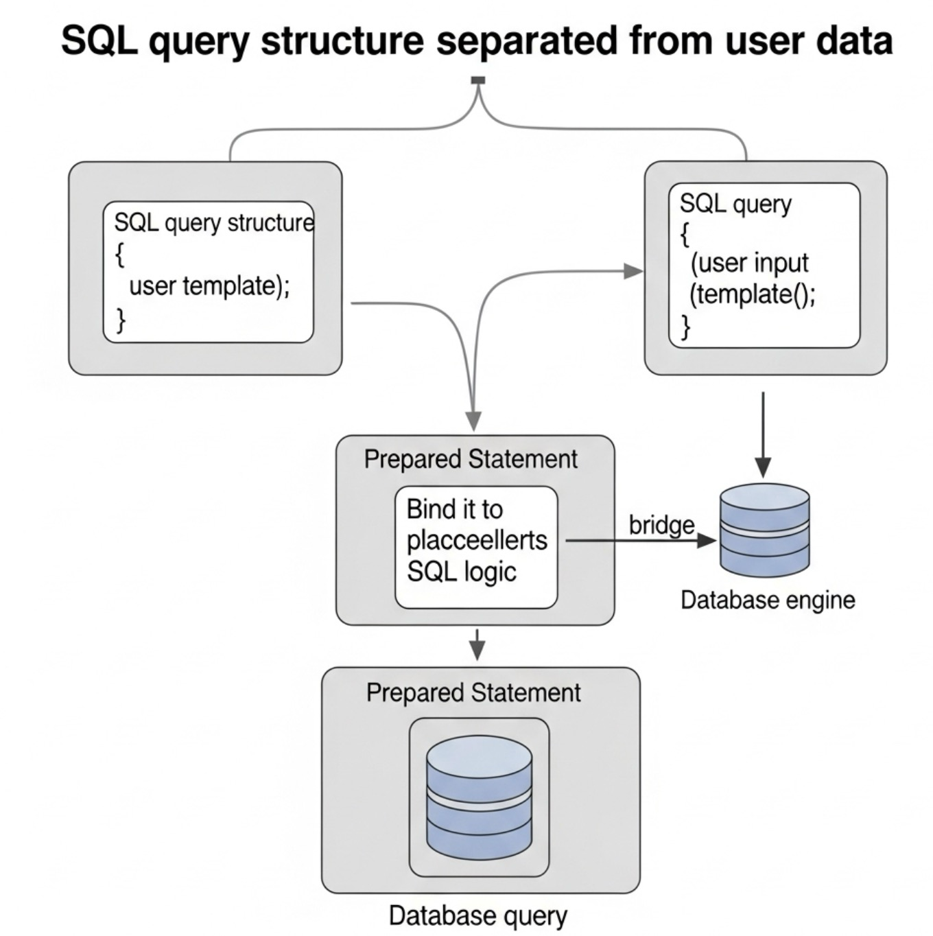 - 데이터 바인딩 및 실행: 나중에 사용자 데이터를 데이터베이스에 별도로 전송하고, 데이터베이스는 이 데이터를 미리 컴파일된 쿼리 구조에 '바인딩'하여 실행합니다. 이때 데이터베이스는 사용자 데이터를 순수한 데이터 값으로만 인식하며, 어떤 경우에도 실행 가능한 SQL 코드로 해석하지 않습니다.