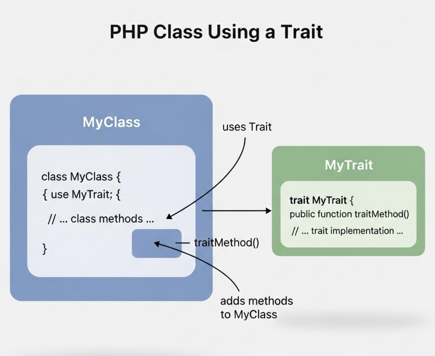 #트레이트(Trait)는 #클래스에_재사용될_메서드_집합을_정의하는_메커니즘입니다. PHP는 단일 상속만 지원하기 때문에 여러 부모 클래스의 기능을 동시에 물려받을 수 없습니다. 트레이트는 이러한 단일 상속의 제약을 보완하여, 마치 여러 부모 클래스를 상속받는 것처럼 여러 트레이트의 기능을 한 클래스에 '주입(inject)'할 수 있게 해줍니다.