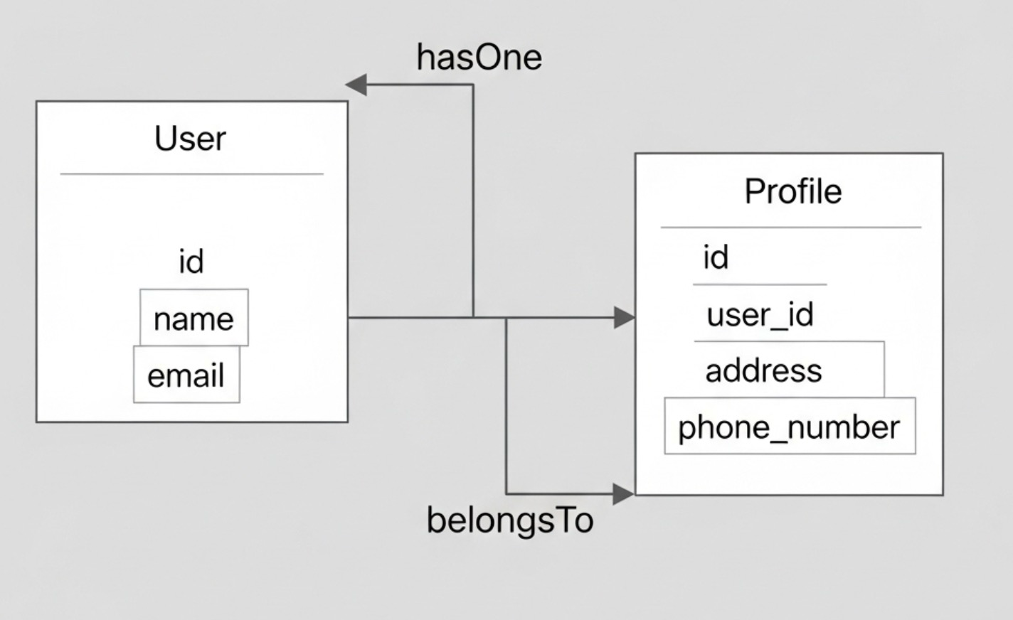 1:1 관계를 정의하려면 두 #모델 모두에 #메서드를 추가해야 해. User #모델에서 Profile에 접근하는 #메서드는 hasOne를, Profile #모델에서 User에 접근하는 #메서드는 belongsTo를 사용해.