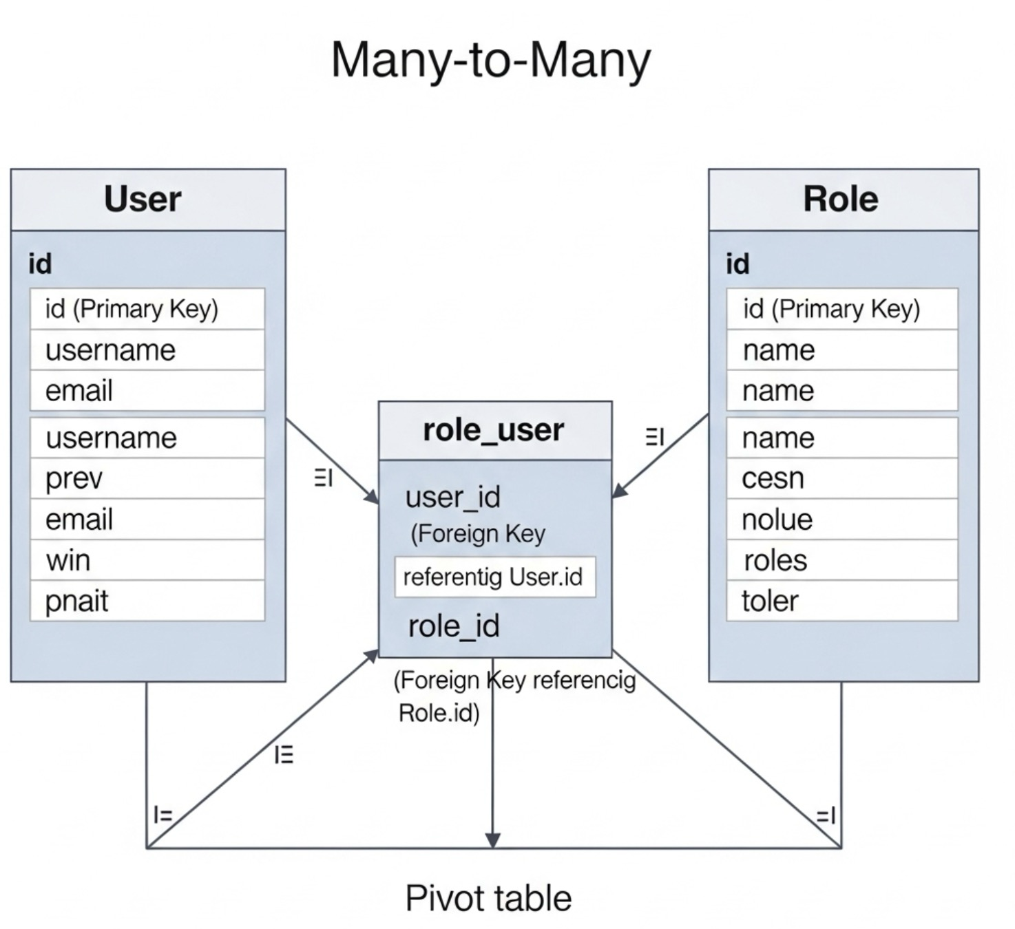 N:M 관계는 양쪽 모두 여러 개의 레코드와 연결되는 관계야. 예를 들어, 한 명의 User는 여러 개의 Role을 가질 수 있고, 하나의 Role은 여러 명의 User에게 할당될 수 있지. #N:M 관계는 보통 중간에 **피벗 #테이블(Pivot Table)**을 사용해. (예: role_user #테이블)