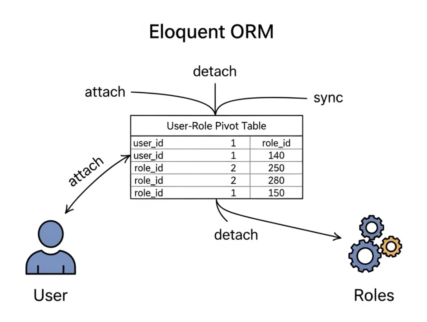 $user->roles()->sync([1, 2]); // id 1, 2번 역할만 연결