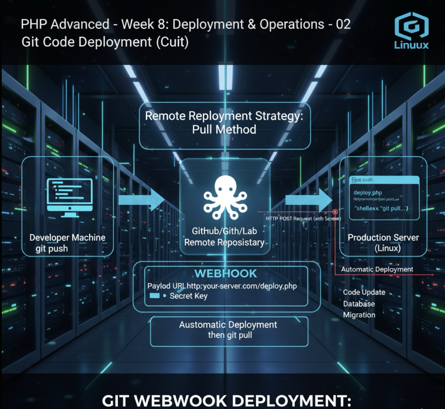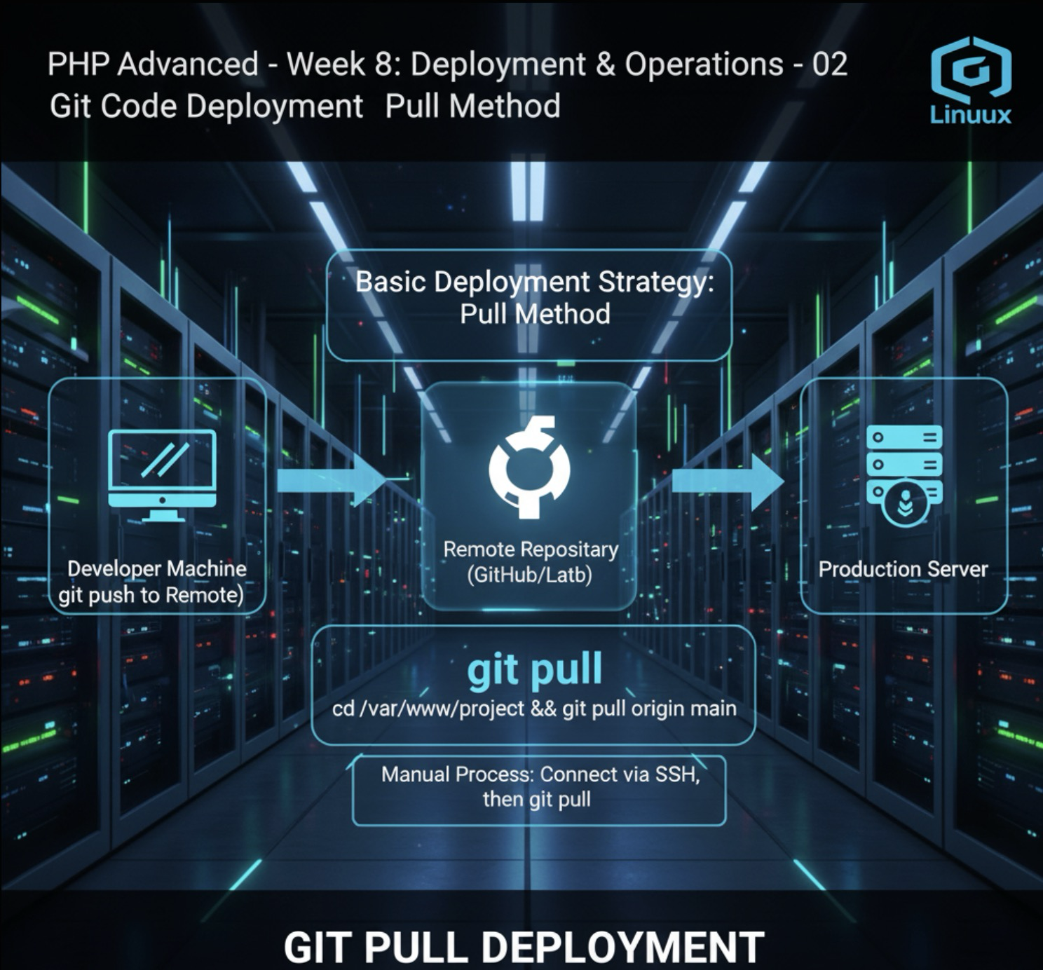Git을 이용한 코드 배포는 현대적인 웹 운영의 기본입니다. 초기에는 수동 git pull로 시작하더라도, 프로젝트가 성장함에 따라 Webhook 또는 전문 배포 도구를 사용하여 배포 프로세스를 자동화하는 것이 안정적인 서비스를 위한 핵심 전략입니다. 다음 시간에는 Nginx와 PHP-FPM을 설정하여 실제 서비스를 구동하는 방법을 알아보겠습니다. 🚀