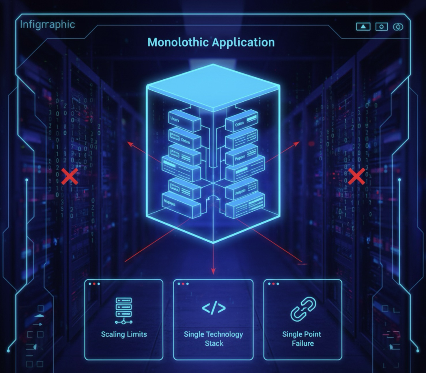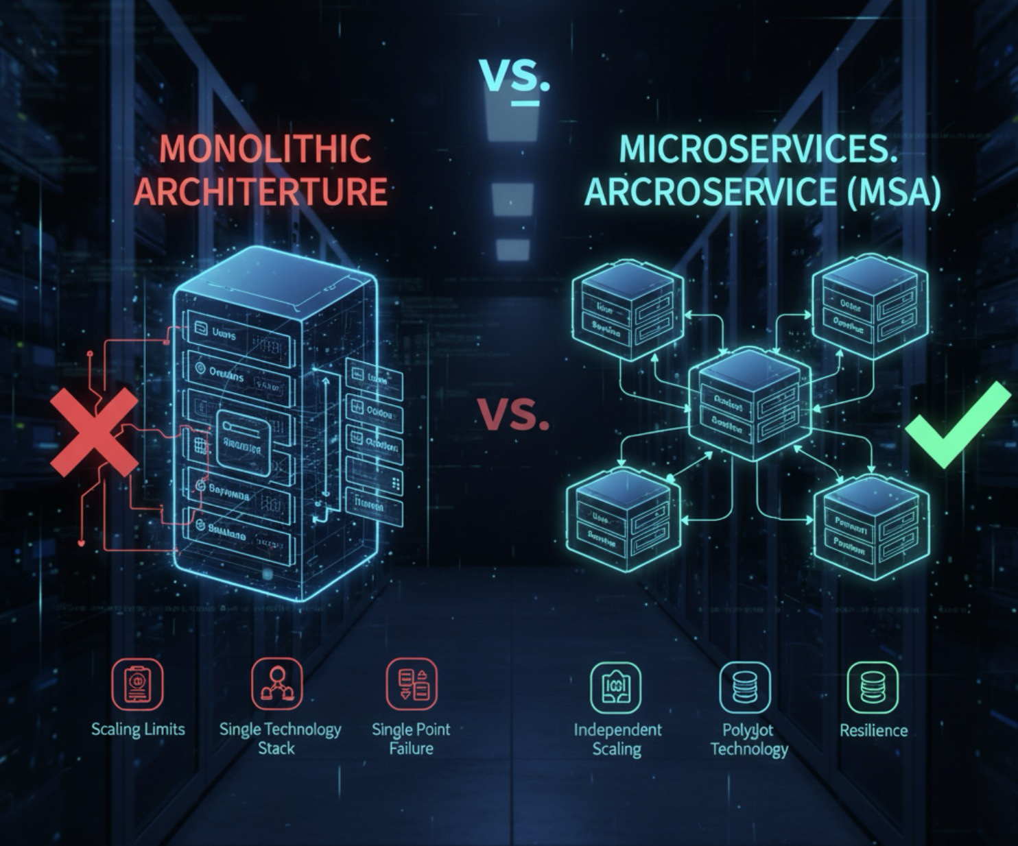 - 확장성의 한계 (Scaling): 특정 기능(예: 주문 처리)에만 부하가 몰려도 전체 애플리케이션을 수직 확장해야 합니다. 비효율적입니다.