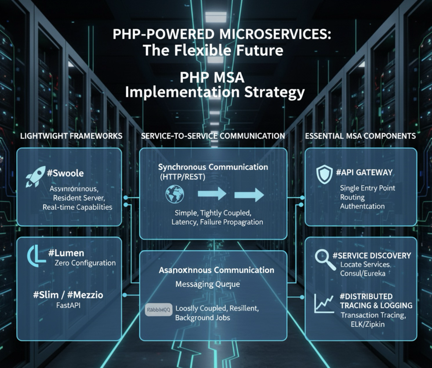PHP는 MSA의 핵심 요구 사항인 빠른 개발 민첩성을 제공하며, Swoole과 같은 기술은 성능 문제까지 해결해 줍니다. 성공적인 MSA 구현은 단순히 서비스를 분리하는 것을 넘어, 비동기 통신 전략을 채택하고, API 게이트웨이, 서비스 디스커버리 같은 #운영_인프라 를 견고하게 구축하는 데 달려 있습니다. 다음 주차부터는 이 구성 요소들을 PHP로 구현하는 실습 위주의 내용을 다루겠습니다. 🛠️