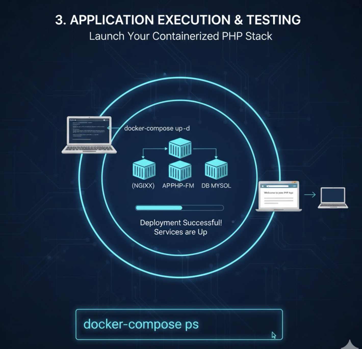모든 서비스가 Up 상태인지 확인합니다. 이제 호스트 브라우저에서 localhost (또는 Nginx가 매핑한 포트)로 접속하여 #PHP애플리케이션 이 정상적으로 동작하는지 테스트할 수 있습니다.
