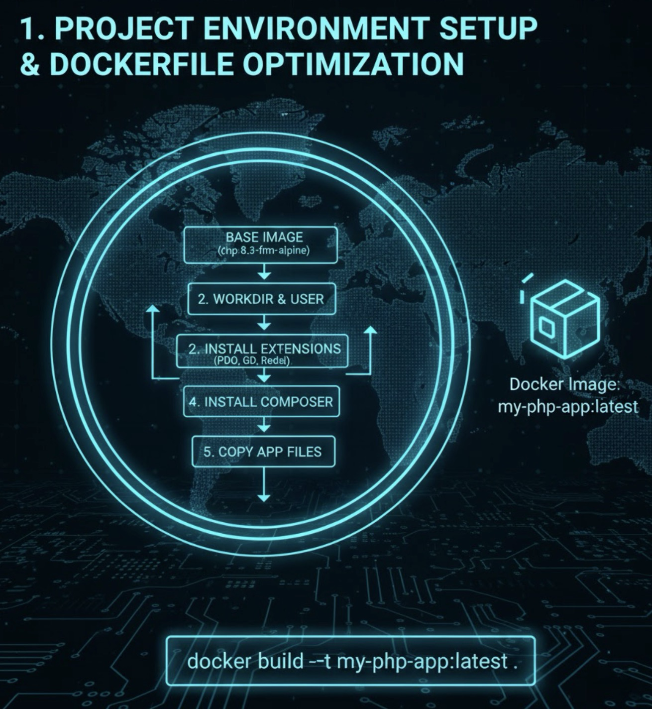 가장 먼저, #PHP애플리케이션 의 실행 환경을 정의하는 #Dockerfile 을 프로젝트에 맞게 최적화해야 합니다.