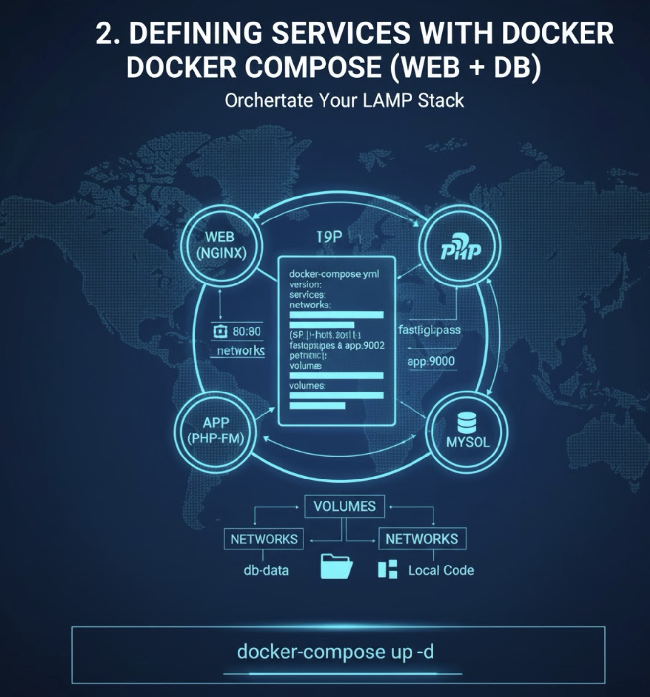 이 명령어는 모든 이미지를 빌드하고, 컨테이너를 시작하며, 필요한 네트워크를 구성하여 #PHP애플리케이션 이 웹 서버와 데이터베이스에 접근할 수 있도록 환경을 완성합니다.