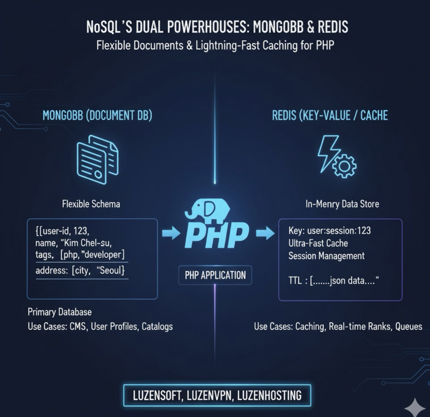 #MongoDB 는 복잡하고 유연한 데이터를 저장하는 메인 데이터베이스로, #Redis 는 초고속 캐싱 및 세션 관리를 위한 보조 저장소로 활용되어 #PHP개발 의 성능을 비약적으로 향상시킬 수 있습니다.