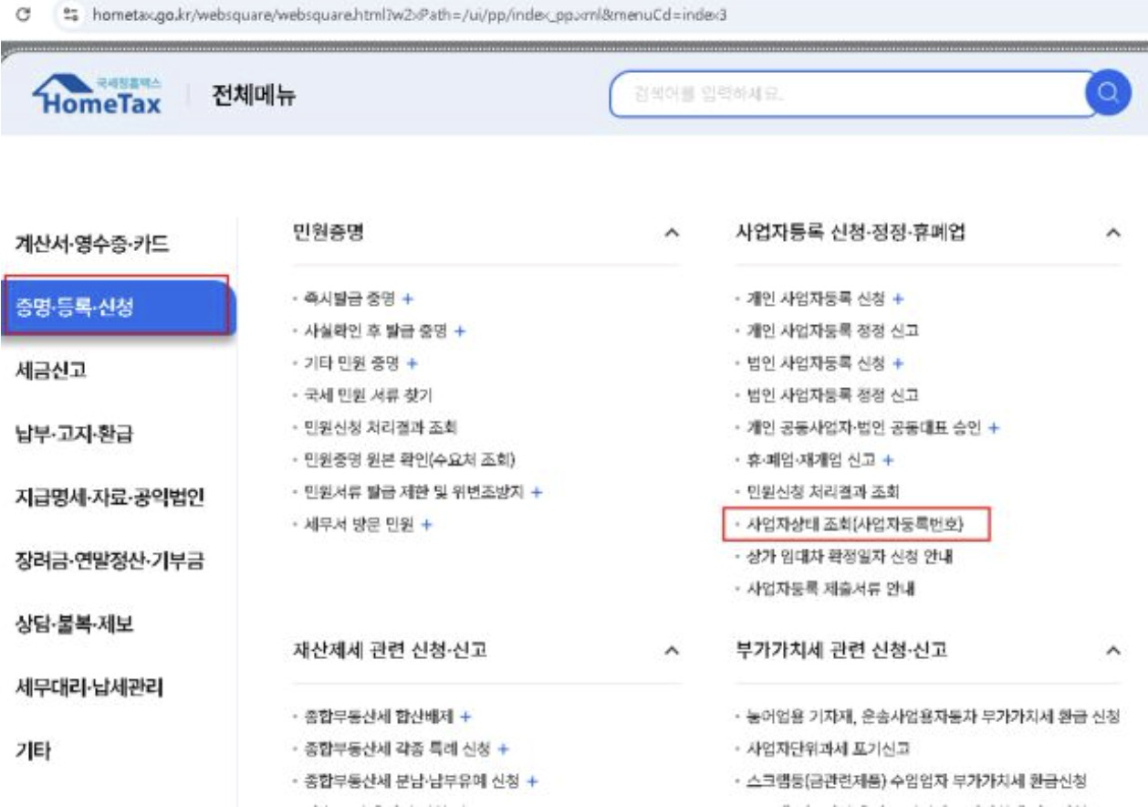 전체메뉴 -> 증명,등록,신청 -> 사업자상태 조회(사업자등록번호)