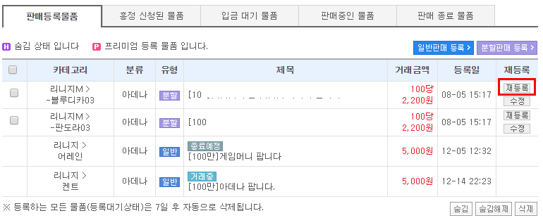 (프리미엄이 설정된 물품은 삭제 하지 않고 재등록으로 처리됩니다.)